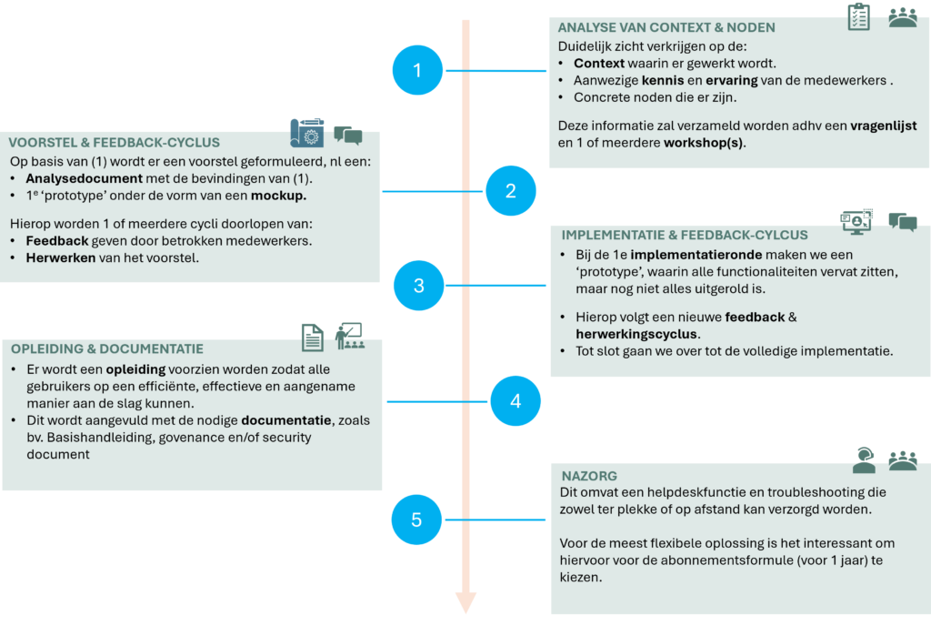 Deze dienstverlening voor een opstartpakket of optimalisatietraject volgt steeds een aantal vaste stappen. De tijdsinvestering per stap is afhankelijk van de complexiteit van de vraag en het aantal medewerkers dat betrokken dient te worden.